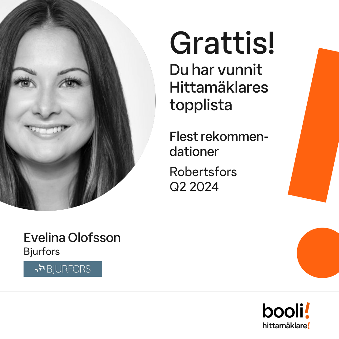 Statistik för publicerade bostäder, försäljningar och omdömen baseras på data från Booli och Hittamäklare. Statistiken för försäljningar avser inrapporterade och verifierade slutpriser från mäklare eller av Booli inhämtade och verifierade slutpriser. Statistiken för publicerade bostäder baseras på information som publicerats på Booli.se. Statistik för omdömen och rekommendationer baseras på omdömen från säljare som lämnats via Booli och Hittamäklare.