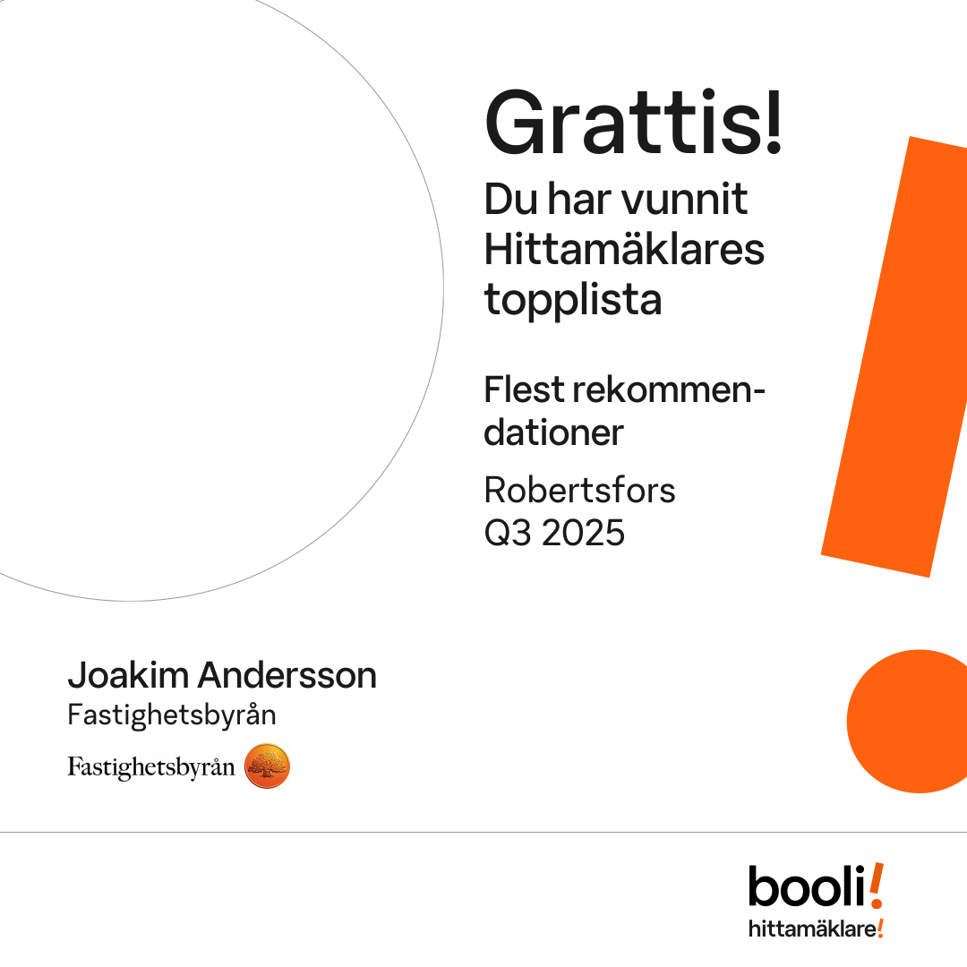 Statistik för publicerade bostäder, försäljningar och omdömen baseras på data från Booli och Hittamäklare. Statistiken för försäljningar avser inrapporterade och verifierade slutpriser från mäklare eller av Booli inhämtade och verifierade slutpriser. Statistiken för publicerade bostäder baseras på information som publicerats på Booli.se. Statistik för omdömen och rekommendationer baseras på omdömen från säljare som lämnats via Booli och Hittamäklare.