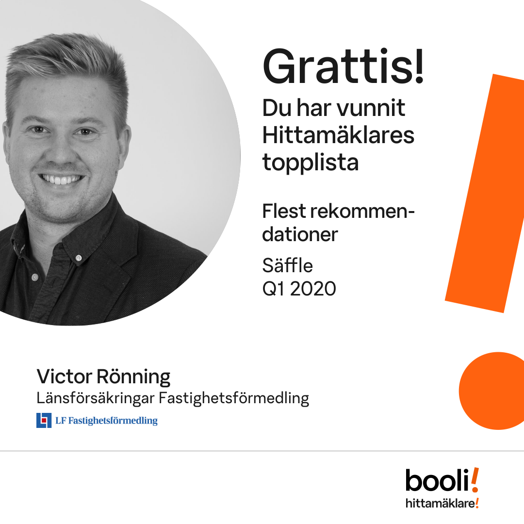 Statistik för publicerade bostäder, försäljningar och omdömen baseras på data från Booli och Hittamäklare. Statistiken för försäljningar avser inrapporterade och verifierade slutpriser från mäklare eller av Booli inhämtade och verifierade slutpriser. Statistiken för publicerade bostäder baseras på information som publicerats på Booli.se. Statistik för omdömen och rekommendationer baseras på omdömen från säljare som lämnats via Booli och Hittamäklare.