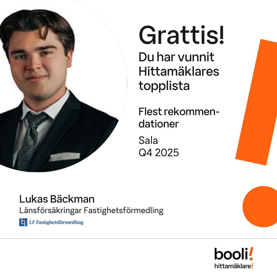Statistik för publicerade bostäder, försäljningar och omdömen baseras på data från Booli och Hittamäklare. Statistiken för försäljningar avser inrapporterade och verifierade slutpriser från mäklare eller av Booli inhämtade och verifierade slutpriser. Statistiken för publicerade bostäder baseras på information som publicerats på Booli.se. Statistik för omdömen och rekommendationer baseras på omdömen från säljare som lämnats via Booli och Hittamäklare.