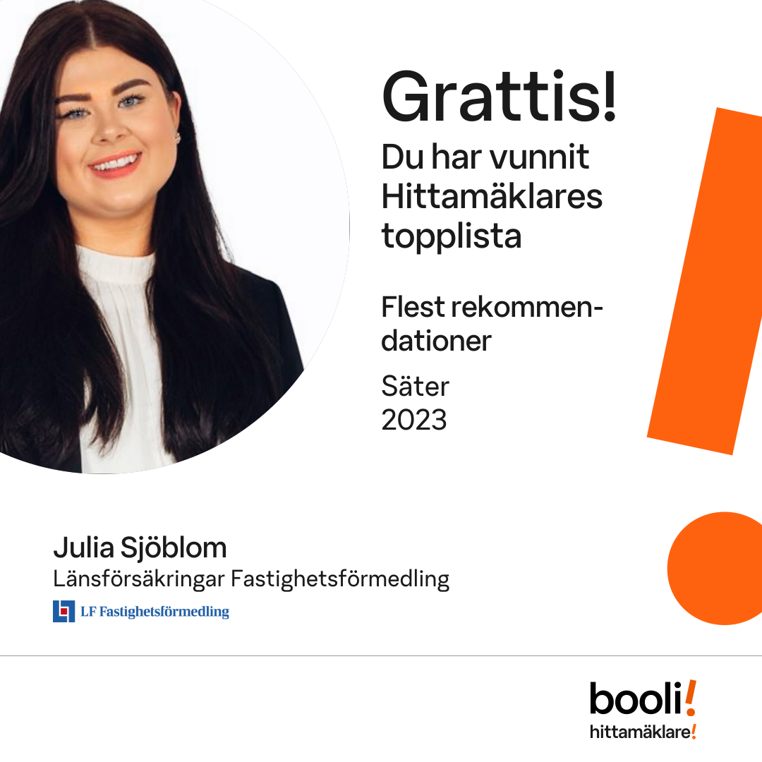 Statistik för publicerade bostäder, försäljningar och omdömen baseras på data från Booli och Hittamäklare. Statistiken för försäljningar avser inrapporterade och verifierade slutpriser från mäklare eller av Booli inhämtade och verifierade slutpriser. Statistiken för publicerade bostäder baseras på information som publicerats på Booli.se. Statistik för omdömen och rekommendationer baseras på omdömen från säljare som lämnats via Booli och Hittamäklare.