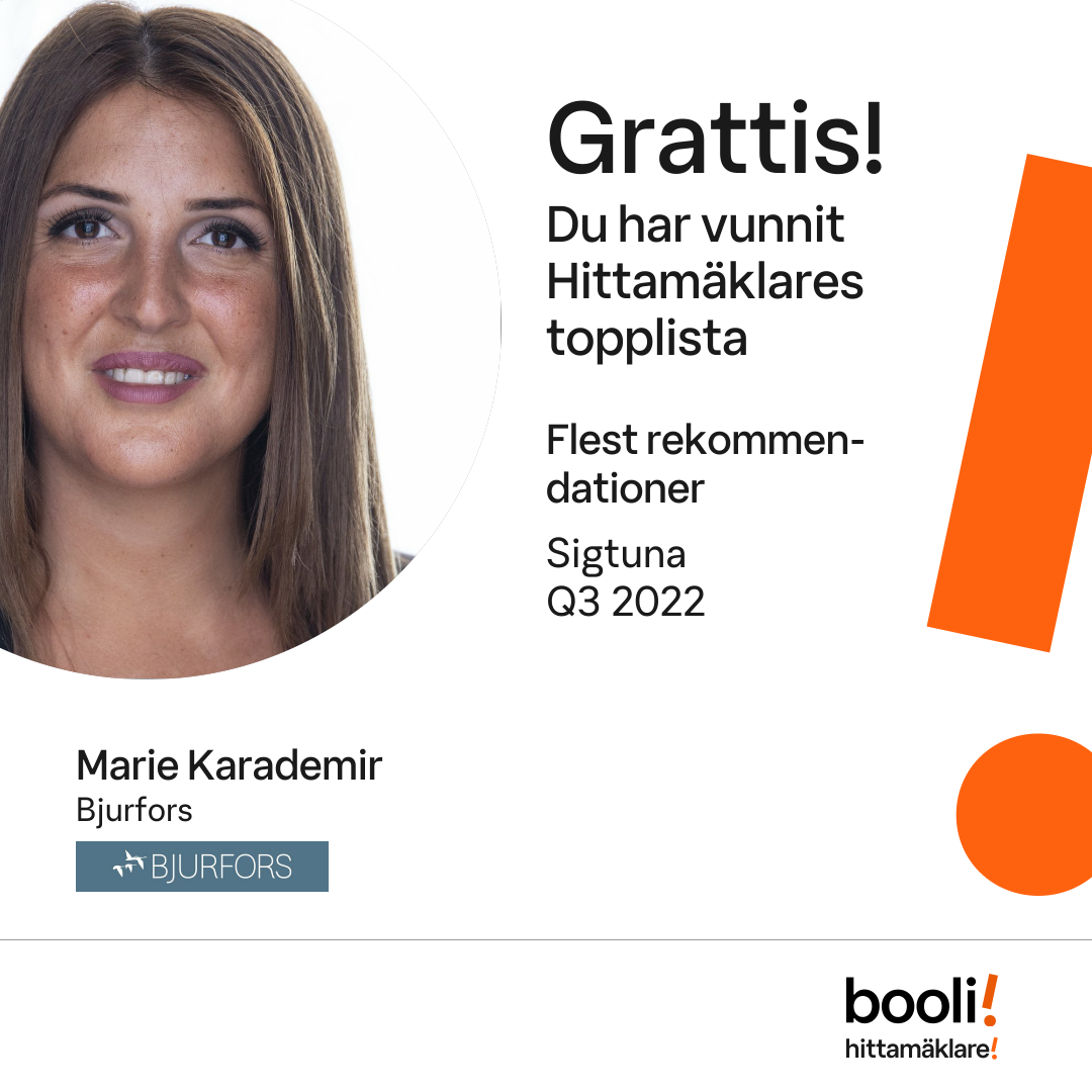 Statistik för publicerade bostäder, försäljningar och omdömen baseras på data från Booli och Hittamäklare. Statistiken för försäljningar avser inrapporterade och verifierade slutpriser från mäklare eller av Booli inhämtade och verifierade slutpriser. Statistiken för publicerade bostäder baseras på information som publicerats på Booli.se. Statistik för omdömen och rekommendationer baseras på omdömen från säljare som lämnats via Booli och Hittamäklare.