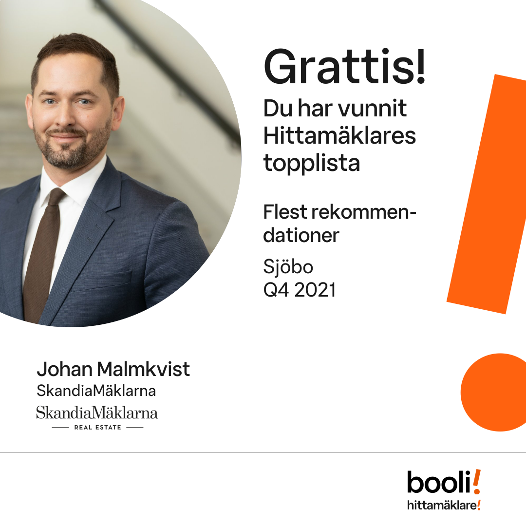 Statistik för publicerade bostäder, försäljningar och omdömen baseras på data från Booli och Hittamäklare. Statistiken för försäljningar avser inrapporterade och verifierade slutpriser från mäklare eller av Booli inhämtade och verifierade slutpriser. Statistiken för publicerade bostäder baseras på information som publicerats på Booli.se. Statistik för omdömen och rekommendationer baseras på omdömen från säljare som lämnats via Booli och Hittamäklare.