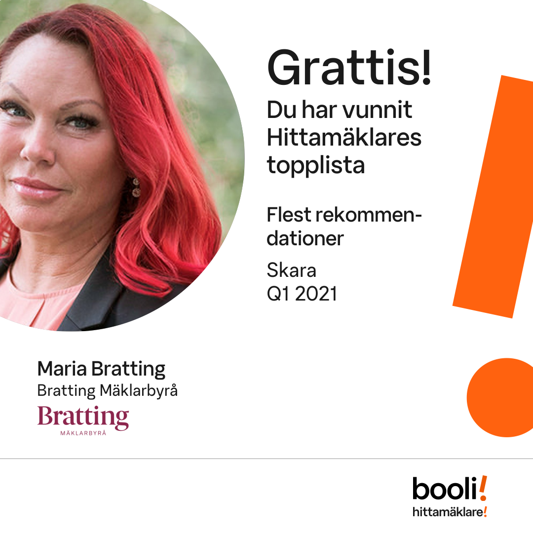 Statistik för publicerade bostäder, försäljningar och omdömen baseras på data från Booli och Hittamäklare. Statistiken för försäljningar avser inrapporterade och verifierade slutpriser från mäklare eller av Booli inhämtade och verifierade slutpriser. Statistiken för publicerade bostäder baseras på information som publicerats på Booli.se. Statistik för omdömen och rekommendationer baseras på omdömen från säljare som lämnats via Booli och Hittamäklare.
