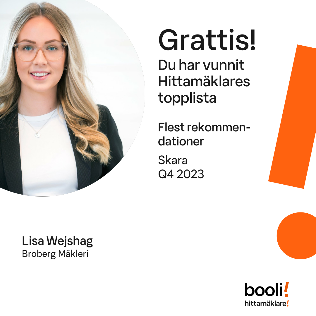 Statistik för publicerade bostäder, försäljningar och omdömen baseras på data från Booli och Hittamäklare. Statistiken för försäljningar avser inrapporterade och verifierade slutpriser från mäklare eller av Booli inhämtade och verifierade slutpriser. Statistiken för publicerade bostäder baseras på information som publicerats på Booli.se. Statistik för omdömen och rekommendationer baseras på omdömen från säljare som lämnats via Booli och Hittamäklare.