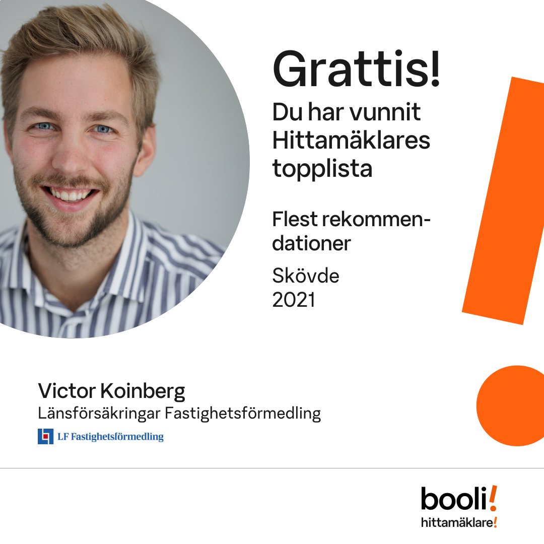 Statistik för publicerade bostäder, försäljningar och omdömen baseras på data från Booli och Hittamäklare. Statistiken för försäljningar avser inrapporterade och verifierade slutpriser från mäklare eller av Booli inhämtade och verifierade slutpriser. Statistiken för publicerade bostäder baseras på information som publicerats på Booli.se. Statistik för omdömen och rekommendationer baseras på omdömen från säljare som lämnats via Booli och Hittamäklare.