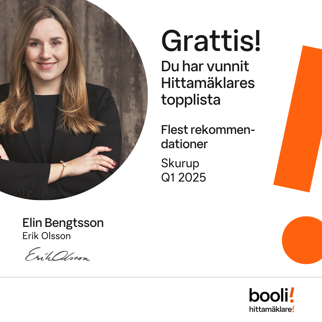 Statistik för publicerade bostäder, försäljningar och omdömen baseras på data från Booli och Hittamäklare. Statistiken för försäljningar avser inrapporterade och verifierade slutpriser från mäklare eller av Booli inhämtade och verifierade slutpriser. Statistiken för publicerade bostäder baseras på information som publicerats på Booli.se. Statistik för omdömen och rekommendationer baseras på omdömen från säljare som lämnats via Booli och Hittamäklare.