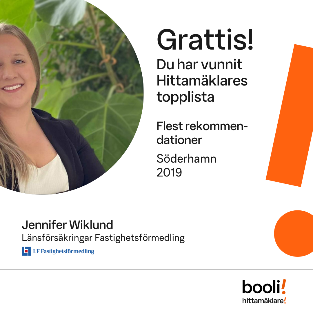 Statistik för publicerade bostäder, försäljningar och omdömen baseras på data från Booli och Hittamäklare. Statistiken för försäljningar avser inrapporterade och verifierade slutpriser från mäklare eller av Booli inhämtade och verifierade slutpriser. Statistiken för publicerade bostäder baseras på information som publicerats på Booli.se. Statistik för omdömen och rekommendationer baseras på omdömen från säljare som lämnats via Booli och Hittamäklare.