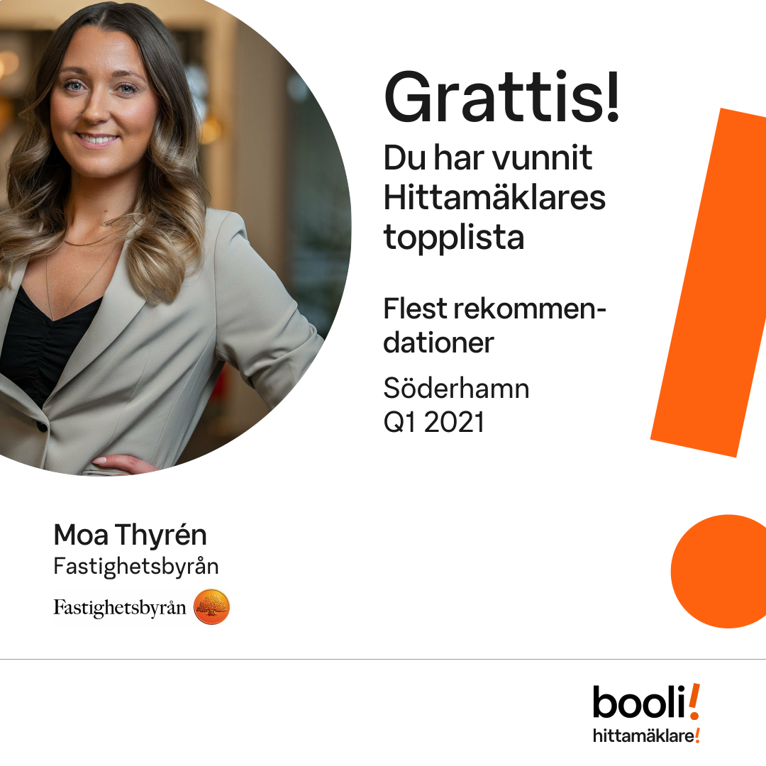 Statistik för publicerade bostäder, försäljningar och omdömen baseras på data från Booli och Hittamäklare. Statistiken för försäljningar avser inrapporterade och verifierade slutpriser från mäklare eller av Booli inhämtade och verifierade slutpriser. Statistiken för publicerade bostäder baseras på information som publicerats på Booli.se. Statistik för omdömen och rekommendationer baseras på omdömen från säljare som lämnats via Booli och Hittamäklare.