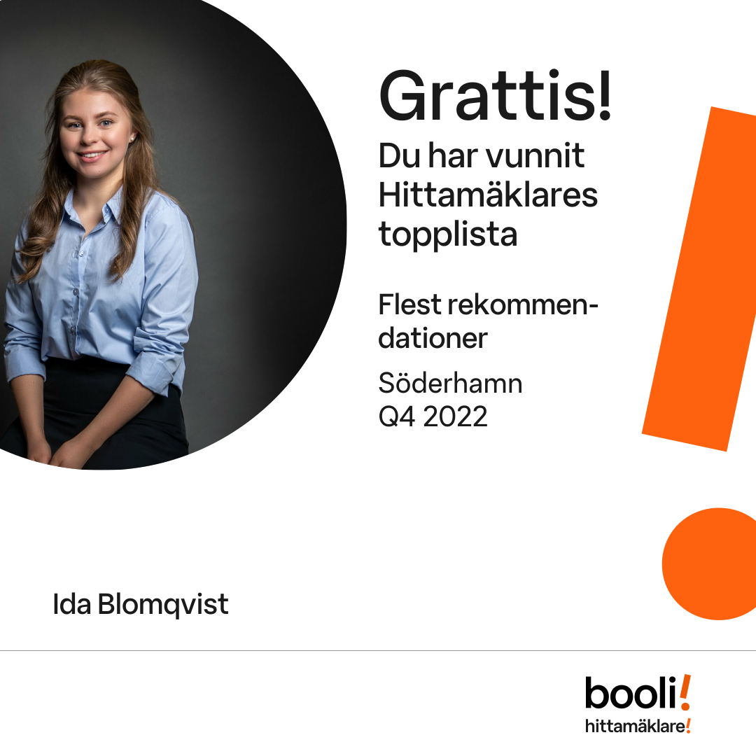 Statistik för publicerade bostäder, försäljningar och omdömen baseras på data från Booli och Hittamäklare. Statistiken för försäljningar avser inrapporterade och verifierade slutpriser från mäklare eller av Booli inhämtade och verifierade slutpriser. Statistiken för publicerade bostäder baseras på information som publicerats på Booli.se. Statistik för omdömen och rekommendationer baseras på omdömen från säljare som lämnats via Booli och Hittamäklare.