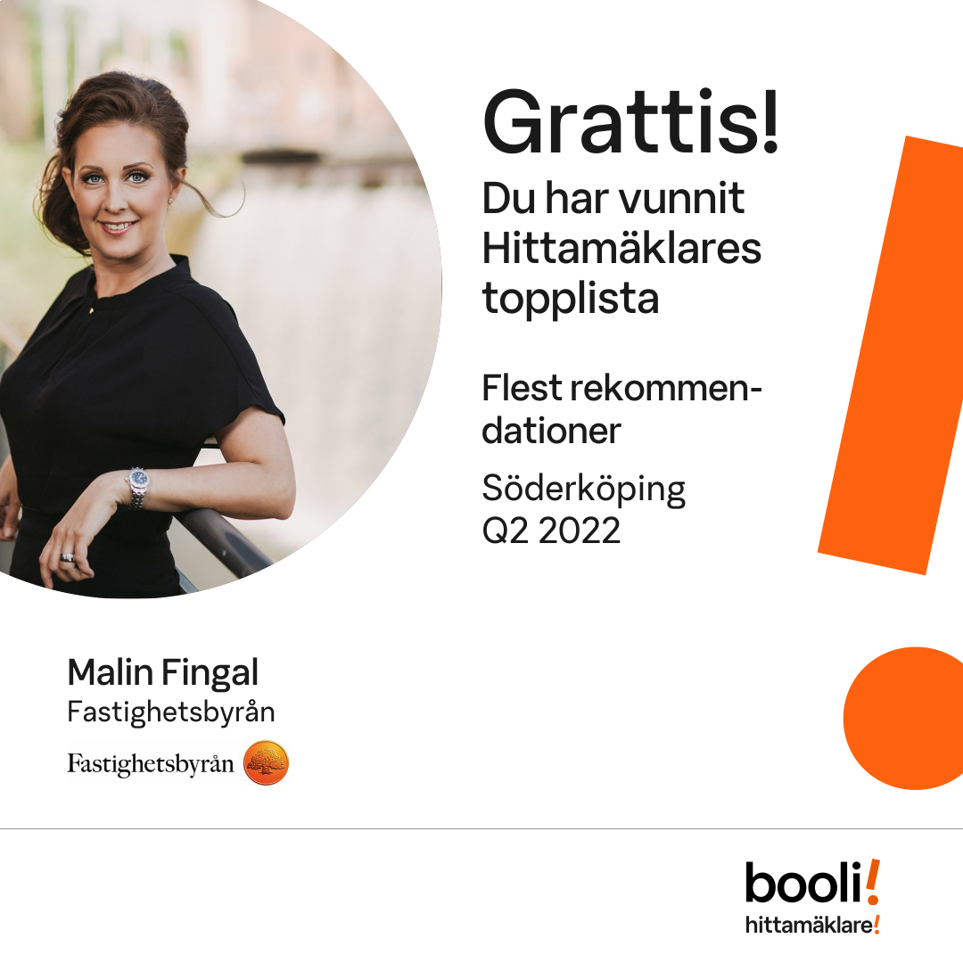 Statistik för publicerade bostäder, försäljningar och omdömen baseras på data från Booli och Hittamäklare. Statistiken för försäljningar avser inrapporterade och verifierade slutpriser från mäklare eller av Booli inhämtade och verifierade slutpriser. Statistiken för publicerade bostäder baseras på information som publicerats på Booli.se. Statistik för omdömen och rekommendationer baseras på omdömen från säljare som lämnats via Booli och Hittamäklare.