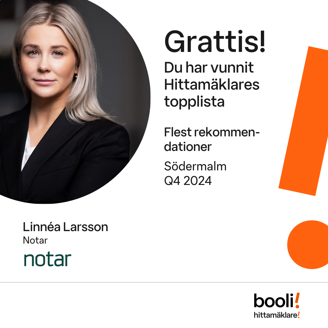 Statistik för publicerade bostäder, försäljningar och omdömen baseras på data från Booli och Hittamäklare. Statistiken för försäljningar avser inrapporterade och verifierade slutpriser från mäklare eller av Booli inhämtade och verifierade slutpriser. Statistiken för publicerade bostäder baseras på information som publicerats på Booli.se. Statistik för omdömen och rekommendationer baseras på omdömen från säljare som lämnats via Booli och Hittamäklare.