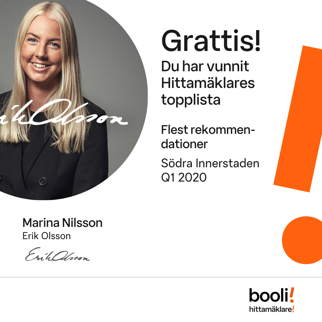 Statistik för publicerade bostäder, försäljningar och omdömen baseras på data från Booli och Hittamäklare. Statistiken för försäljningar avser inrapporterade och verifierade slutpriser från mäklare eller av Booli inhämtade och verifierade slutpriser. Statistiken för publicerade bostäder baseras på information som publicerats på Booli.se. Statistik för omdömen och rekommendationer baseras på omdömen från säljare som lämnats via Booli och Hittamäklare.