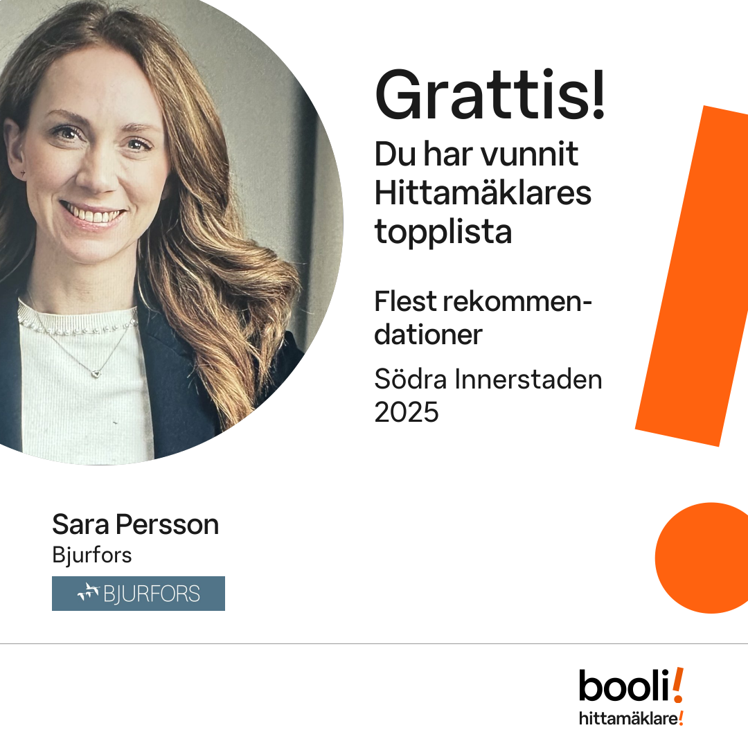 Statistik för publicerade bostäder, försäljningar och omdömen baseras på data från Booli och Hittamäklare. Statistiken för försäljningar avser inrapporterade och verifierade slutpriser från mäklare eller av Booli inhämtade och verifierade slutpriser. Statistiken för publicerade bostäder baseras på information som publicerats på Booli.se. Statistik för omdömen och rekommendationer baseras på omdömen från säljare som lämnats via Booli och Hittamäklare.