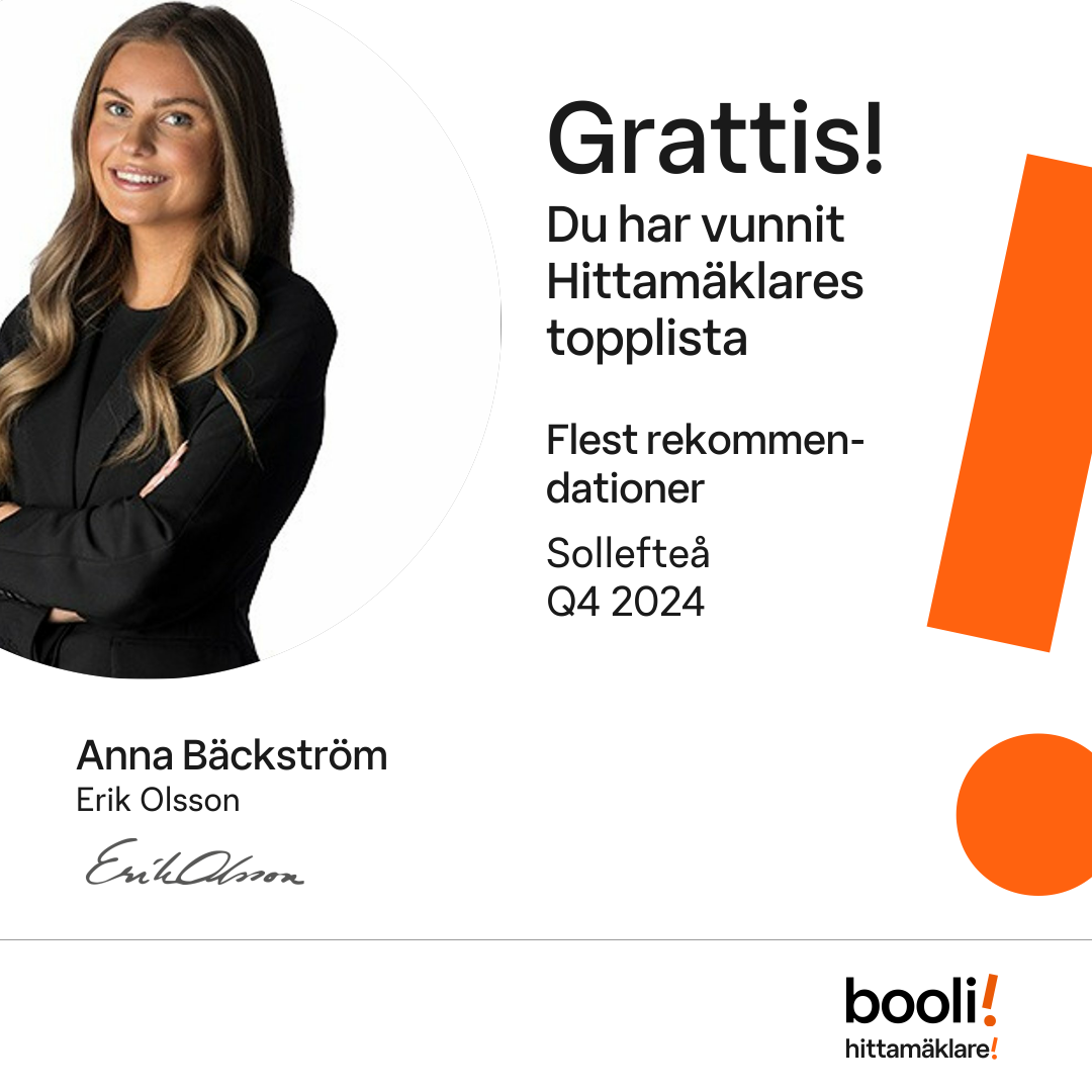 Statistik för publicerade bostäder, försäljningar och omdömen baseras på data från Booli och Hittamäklare. Statistiken för försäljningar avser inrapporterade och verifierade slutpriser från mäklare eller av Booli inhämtade och verifierade slutpriser. Statistiken för publicerade bostäder baseras på information som publicerats på Booli.se. Statistik för omdömen och rekommendationer baseras på omdömen från säljare som lämnats via Booli och Hittamäklare.