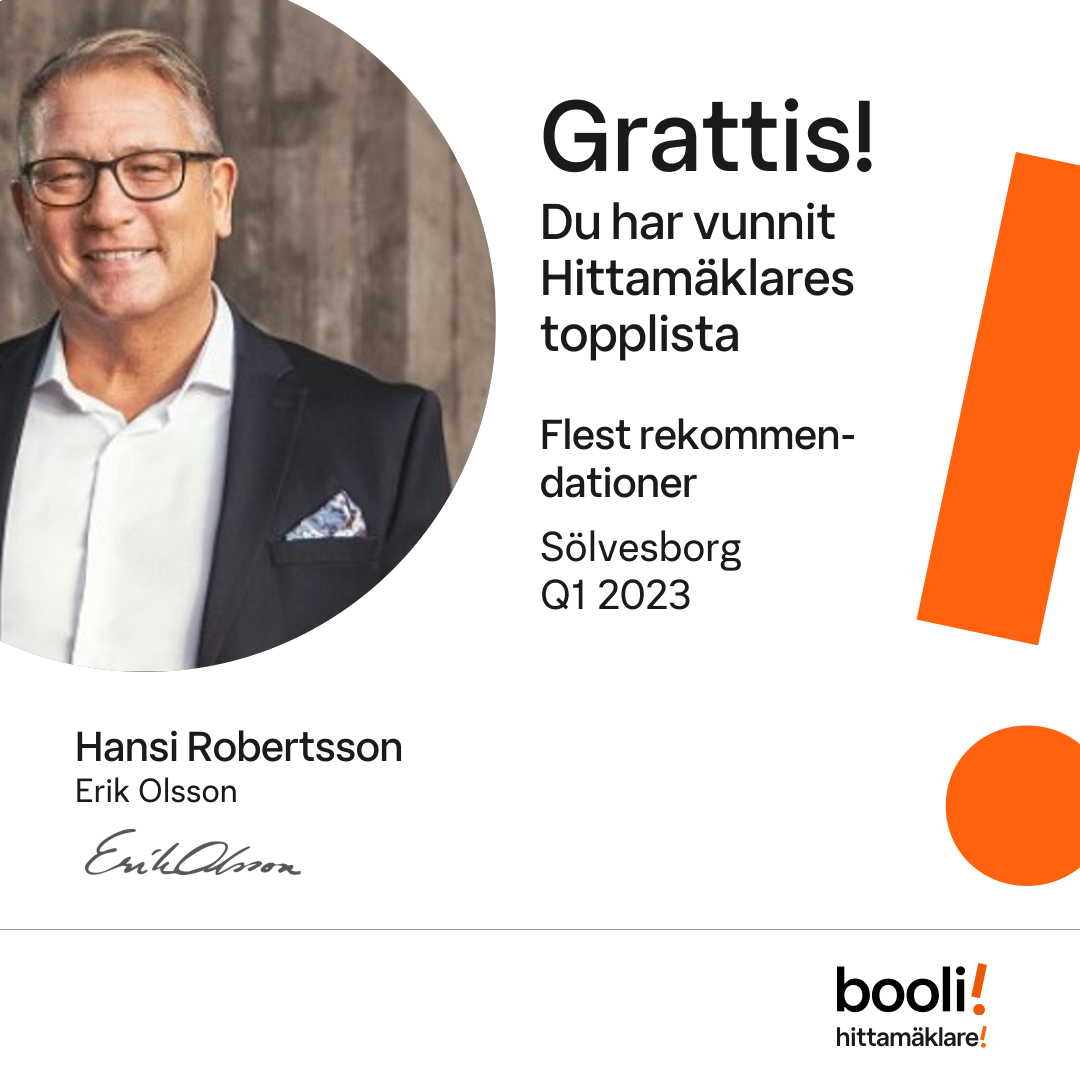 Statistik för publicerade bostäder, försäljningar och omdömen baseras på data från Booli och Hittamäklare. Statistiken för försäljningar avser inrapporterade och verifierade slutpriser från mäklare eller av Booli inhämtade och verifierade slutpriser. Statistiken för publicerade bostäder baseras på information som publicerats på Booli.se. Statistik för omdömen och rekommendationer baseras på omdömen från säljare som lämnats via Booli och Hittamäklare.