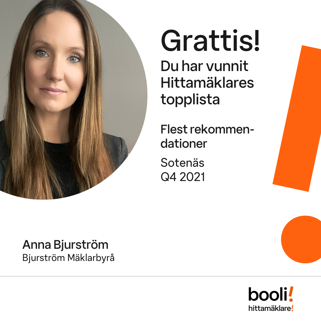 Statistik för publicerade bostäder, försäljningar och omdömen baseras på data från Booli och Hittamäklare. Statistiken för försäljningar avser inrapporterade och verifierade slutpriser från mäklare eller av Booli inhämtade och verifierade slutpriser. Statistiken för publicerade bostäder baseras på information som publicerats på Booli.se. Statistik för omdömen och rekommendationer baseras på omdömen från säljare som lämnats via Booli och Hittamäklare.