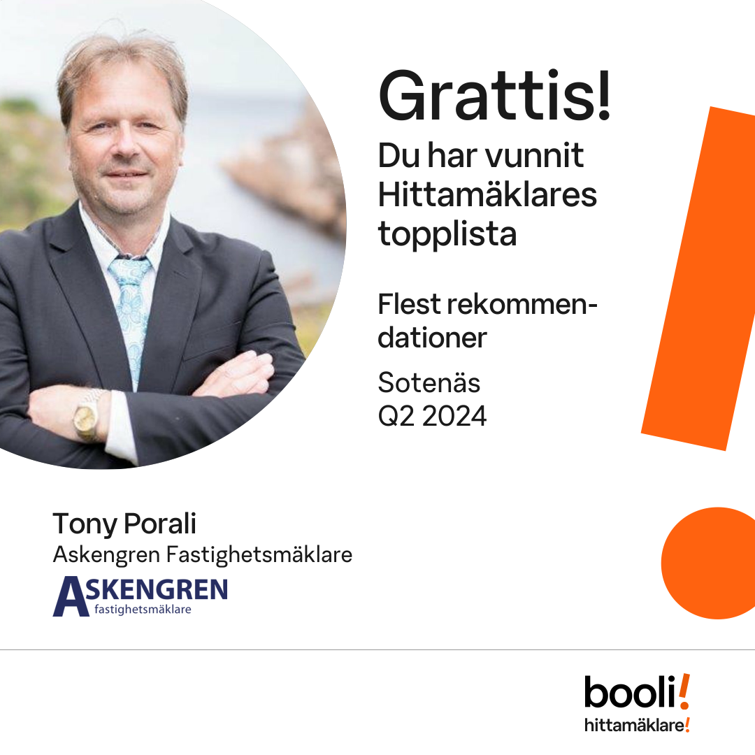 Statistik för publicerade bostäder, försäljningar och omdömen baseras på data från Booli och Hittamäklare. Statistiken för försäljningar avser inrapporterade och verifierade slutpriser från mäklare eller av Booli inhämtade och verifierade slutpriser. Statistiken för publicerade bostäder baseras på information som publicerats på Booli.se. Statistik för omdömen och rekommendationer baseras på omdömen från säljare som lämnats via Booli och Hittamäklare.