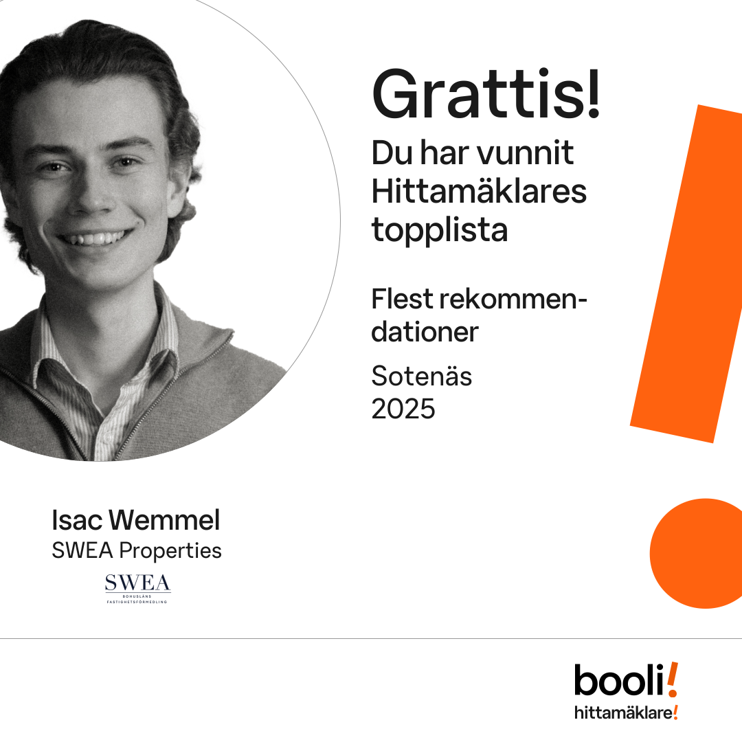Statistik för publicerade bostäder, försäljningar och omdömen baseras på data från Booli och Hittamäklare. Statistiken för försäljningar avser inrapporterade och verifierade slutpriser från mäklare eller av Booli inhämtade och verifierade slutpriser. Statistiken för publicerade bostäder baseras på information som publicerats på Booli.se. Statistik för omdömen och rekommendationer baseras på omdömen från säljare som lämnats via Booli och Hittamäklare.