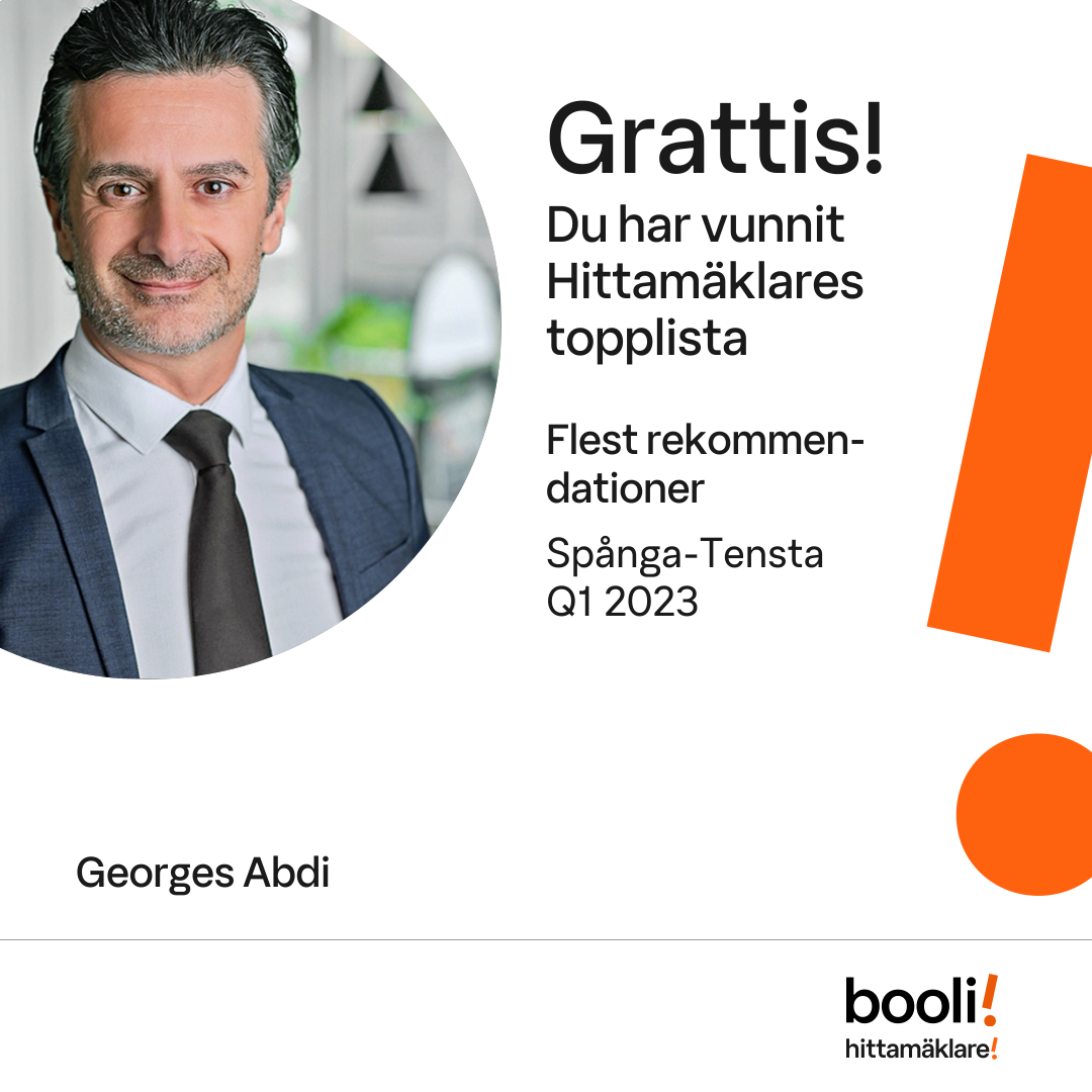 Statistik för publicerade bostäder, försäljningar och omdömen baseras på data från Booli och Hittamäklare. Statistiken för försäljningar avser inrapporterade och verifierade slutpriser från mäklare eller av Booli inhämtade och verifierade slutpriser. Statistiken för publicerade bostäder baseras på information som publicerats på Booli.se. Statistik för omdömen och rekommendationer baseras på omdömen från säljare som lämnats via Booli och Hittamäklare.