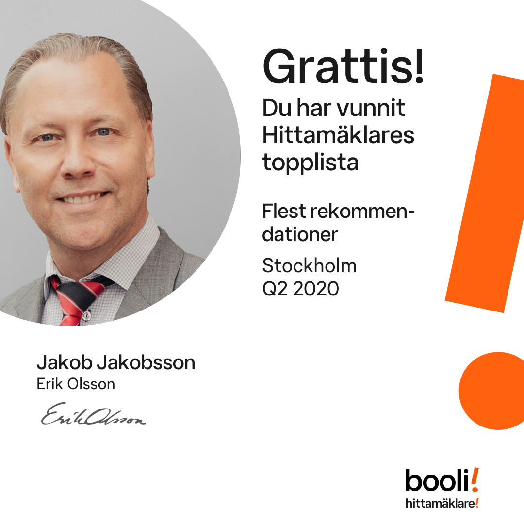 Statistik för publicerade bostäder, försäljningar och omdömen baseras på data från Booli och Hittamäklare. Statistiken för försäljningar avser inrapporterade och verifierade slutpriser från mäklare eller av Booli inhämtade och verifierade slutpriser. Statistiken för publicerade bostäder baseras på information som publicerats på Booli.se. Statistik för omdömen och rekommendationer baseras på omdömen från säljare som lämnats via Booli och Hittamäklare.