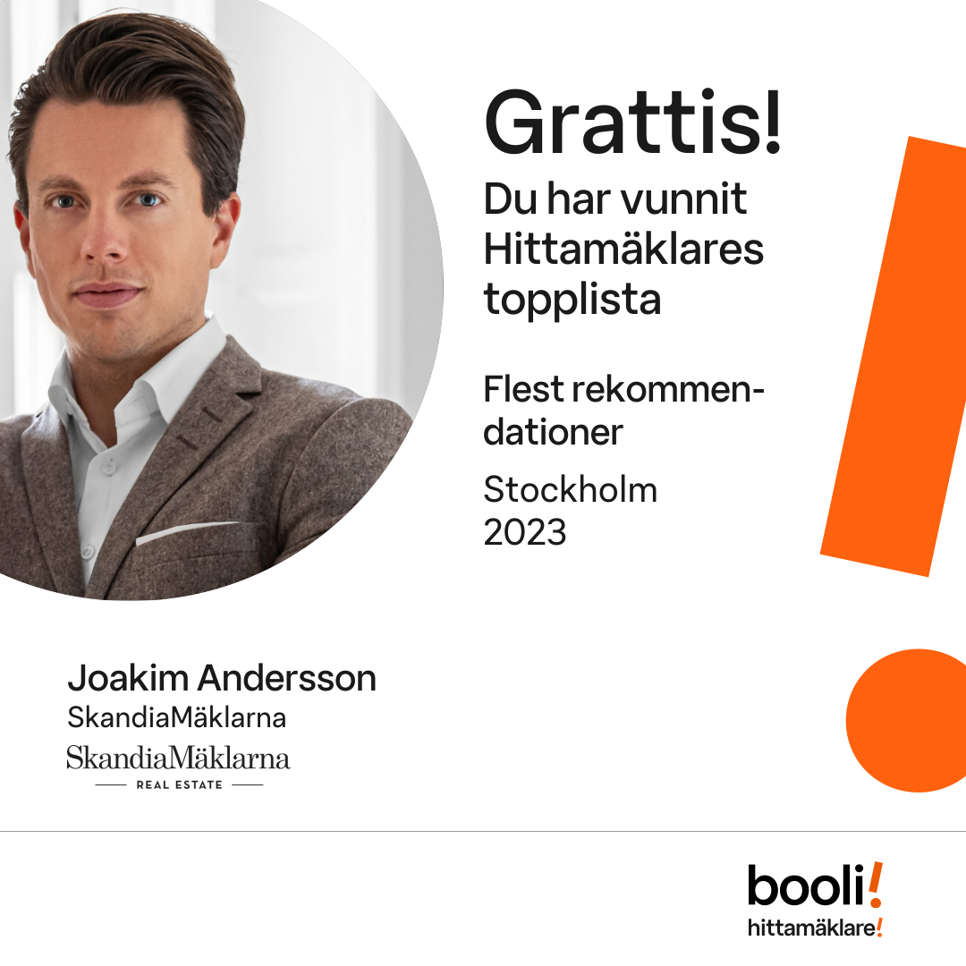 Statistik för publicerade bostäder, försäljningar och omdömen baseras på data från Booli och Hittamäklare. Statistiken för försäljningar avser inrapporterade och verifierade slutpriser från mäklare eller av Booli inhämtade och verifierade slutpriser. Statistiken för publicerade bostäder baseras på information som publicerats på Booli.se. Statistik för omdömen och rekommendationer baseras på omdömen från säljare som lämnats via Booli och Hittamäklare.