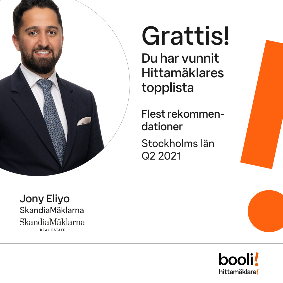 Statistik för publicerade bostäder, försäljningar och omdömen baseras på data från Booli och Hittamäklare. Statistiken för försäljningar avser inrapporterade och verifierade slutpriser från mäklare eller av Booli inhämtade och verifierade slutpriser. Statistiken för publicerade bostäder baseras på information som publicerats på Booli.se. Statistik för omdömen och rekommendationer baseras på omdömen från säljare som lämnats via Booli och Hittamäklare.