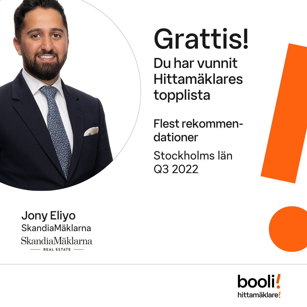 Statistik för publicerade bostäder, försäljningar och omdömen baseras på data från Booli och Hittamäklare. Statistiken för försäljningar avser inrapporterade och verifierade slutpriser från mäklare eller av Booli inhämtade och verifierade slutpriser. Statistiken för publicerade bostäder baseras på information som publicerats på Booli.se. Statistik för omdömen och rekommendationer baseras på omdömen från säljare som lämnats via Booli och Hittamäklare.