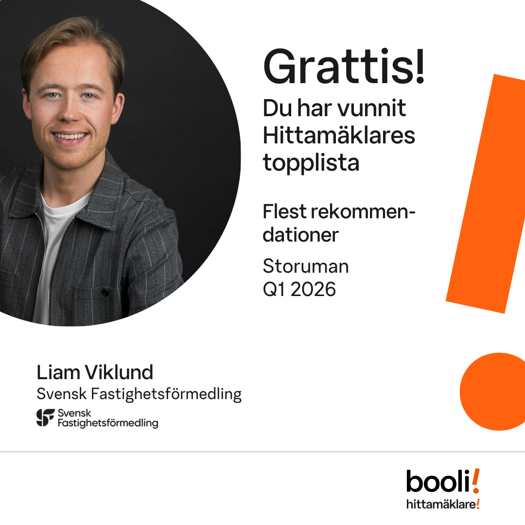Statistik för publicerade bostäder, försäljningar och omdömen baseras på data från Booli. Statistiken för försäljningar avser inrapporterade och verifierade slutpriser från mäklare eller av Booli inhämtade och verifierade slutpriser. Statistiken för publicerade bostäder baseras på information som publicerats på Booli.se. Statistik för omdömen och rekommendationer baseras på omdömen från säljare som lämnats via Booli.