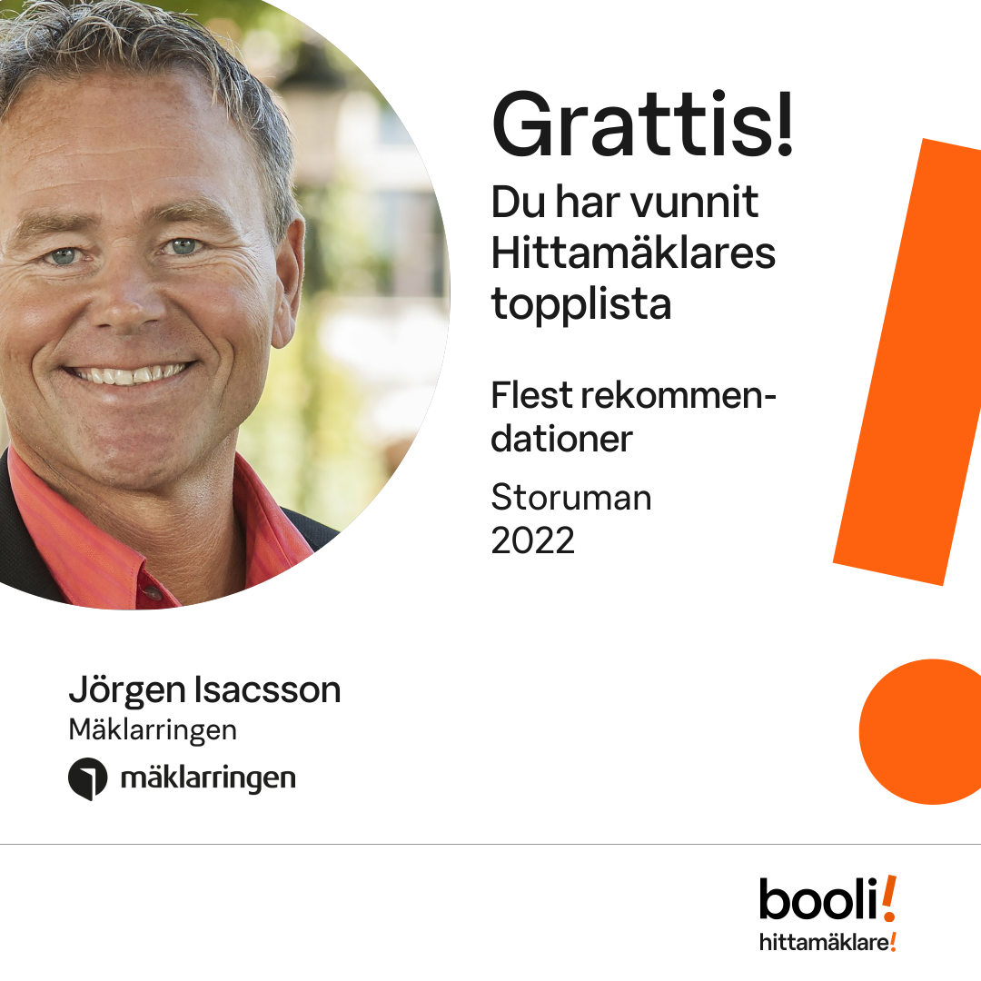 Statistik för publicerade bostäder, försäljningar och omdömen baseras på data från Booli och Hittamäklare. Statistiken för försäljningar avser inrapporterade och verifierade slutpriser från mäklare eller av Booli inhämtade och verifierade slutpriser. Statistiken för publicerade bostäder baseras på information som publicerats på Booli.se. Statistik för omdömen och rekommendationer baseras på omdömen från säljare som lämnats via Booli och Hittamäklare.