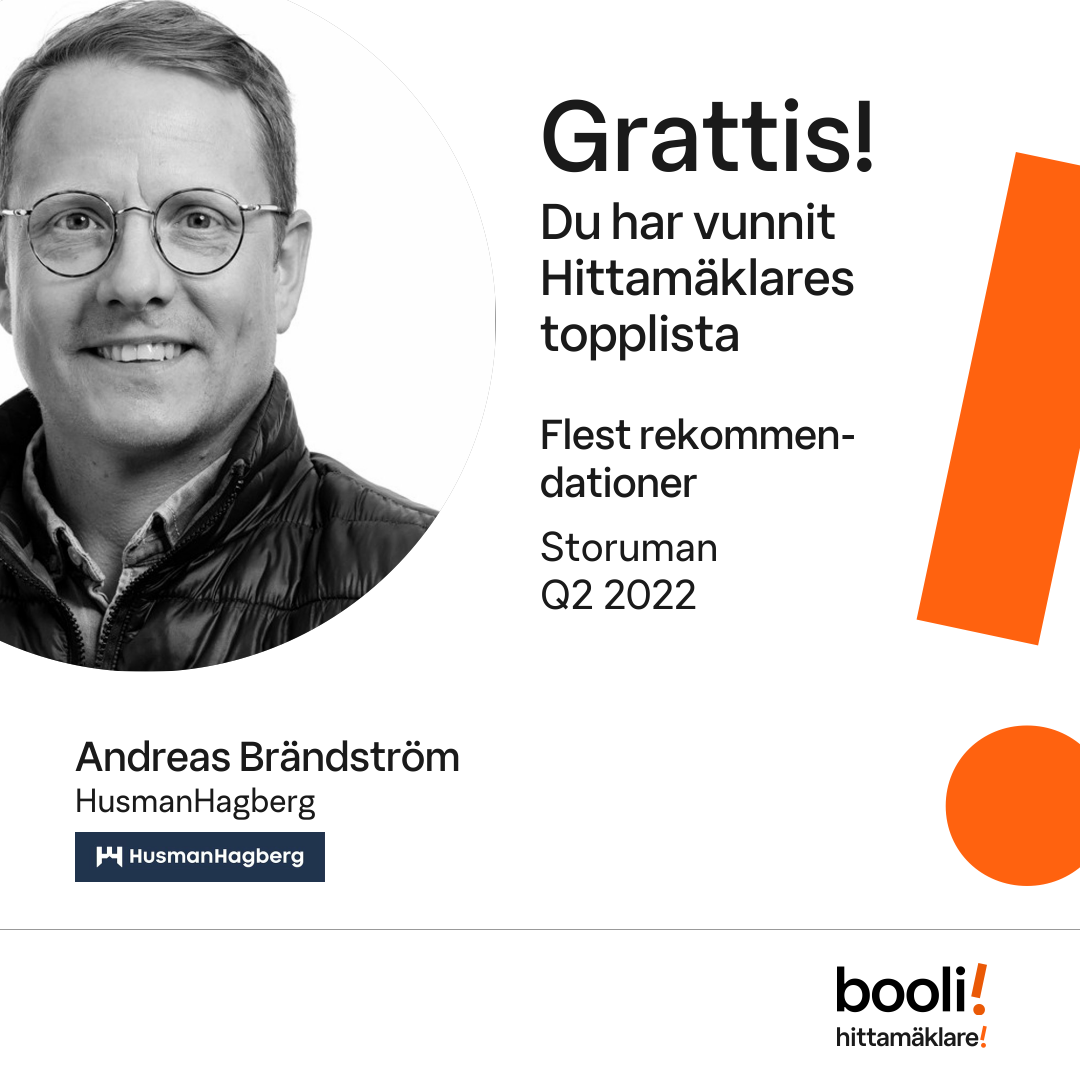 Statistik för publicerade bostäder, försäljningar och omdömen baseras på data från Booli. Statistiken för försäljningar avser inrapporterade och verifierade slutpriser från mäklare eller av Booli inhämtade och verifierade slutpriser. Statistiken för publicerade bostäder baseras på information som publicerats på Booli.se. Statistik för omdömen och rekommendationer baseras på omdömen från säljare som lämnats via Booli.