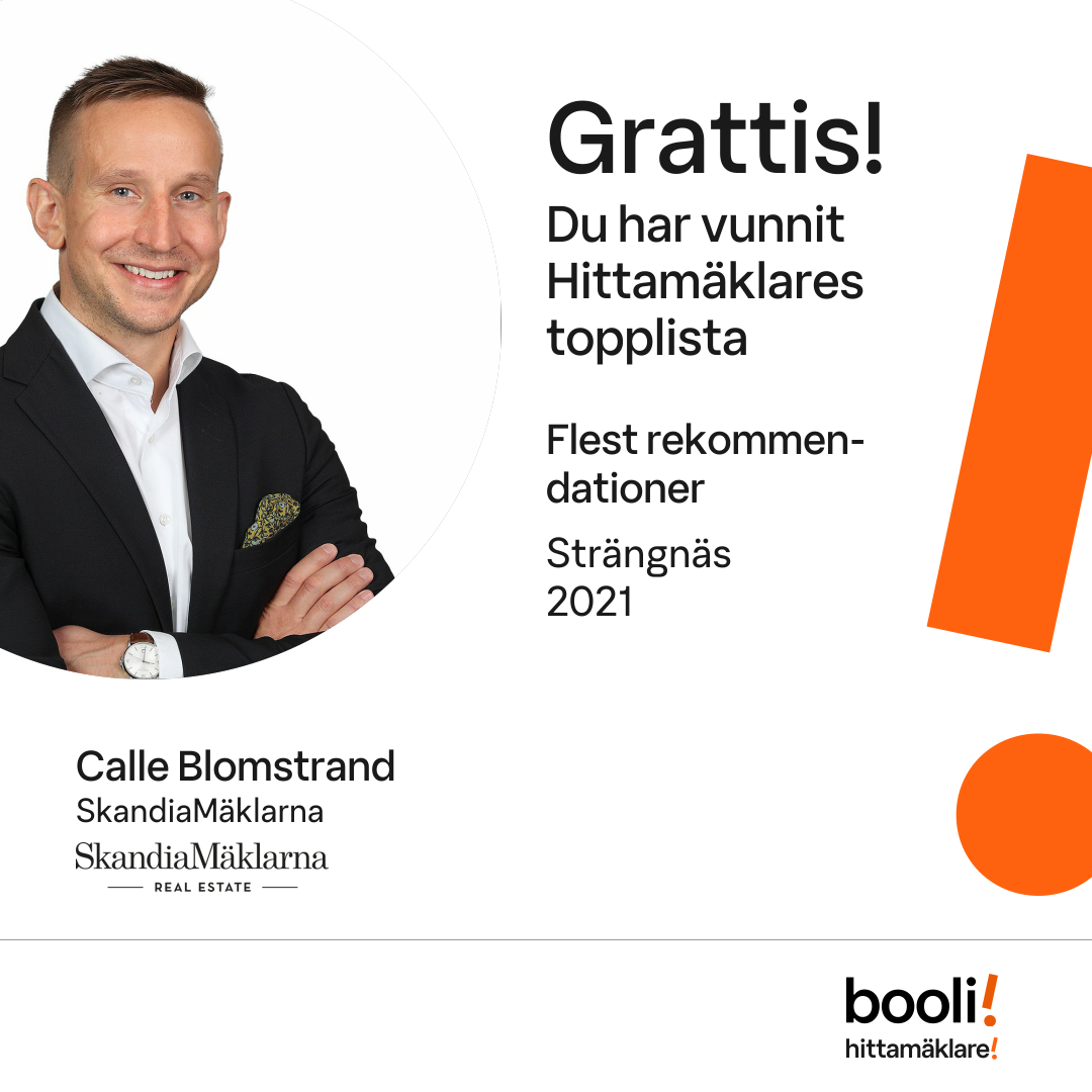 Statistik för publicerade bostäder, försäljningar och omdömen baseras på data från Booli och Hittamäklare. Statistiken för försäljningar avser inrapporterade och verifierade slutpriser från mäklare eller av Booli inhämtade och verifierade slutpriser. Statistiken för publicerade bostäder baseras på information som publicerats på Booli.se. Statistik för omdömen och rekommendationer baseras på omdömen från säljare som lämnats via Booli och Hittamäklare.