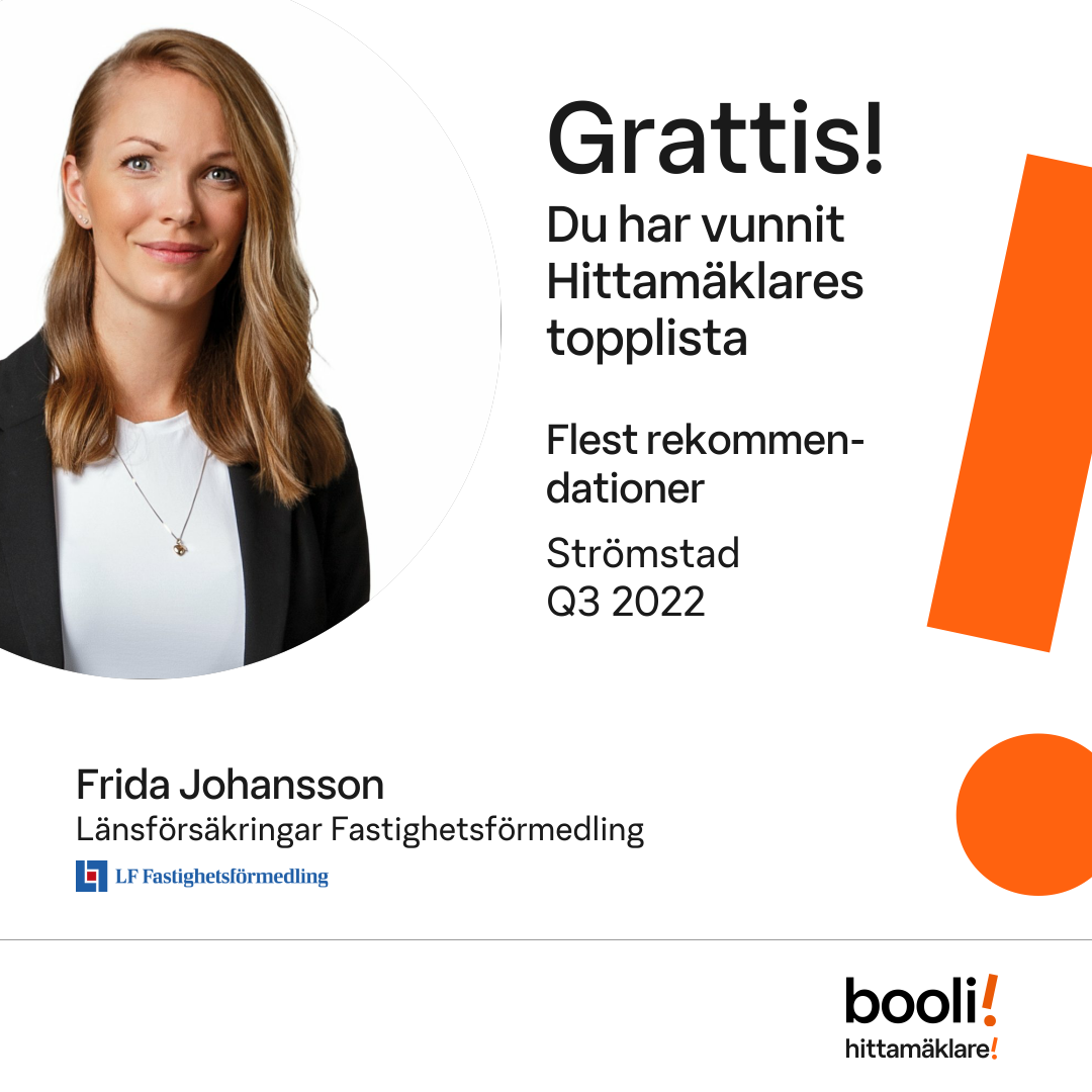 Statistik för publicerade bostäder, försäljningar och omdömen baseras på data från Booli och Hittamäklare. Statistiken för försäljningar avser inrapporterade och verifierade slutpriser från mäklare eller av Booli inhämtade och verifierade slutpriser. Statistiken för publicerade bostäder baseras på information som publicerats på Booli.se. Statistik för omdömen och rekommendationer baseras på omdömen från säljare som lämnats via Booli och Hittamäklare.