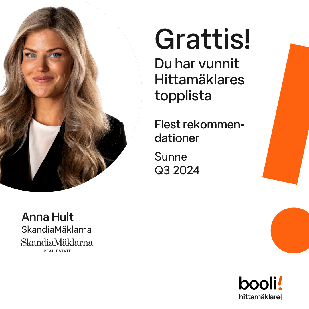 Statistik för publicerade bostäder, försäljningar och omdömen baseras på data från Booli och Hittamäklare. Statistiken för försäljningar avser inrapporterade och verifierade slutpriser från mäklare eller av Booli inhämtade och verifierade slutpriser. Statistiken för publicerade bostäder baseras på information som publicerats på Booli.se. Statistik för omdömen och rekommendationer baseras på omdömen från säljare som lämnats via Booli och Hittamäklare.