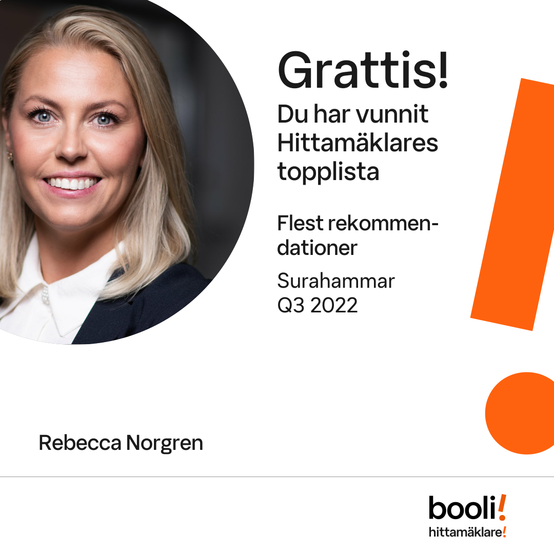 Statistik för publicerade bostäder, försäljningar och omdömen baseras på data från Booli och Hittamäklare. Statistiken för försäljningar avser inrapporterade och verifierade slutpriser från mäklare eller av Booli inhämtade och verifierade slutpriser. Statistiken för publicerade bostäder baseras på information som publicerats på Booli.se. Statistik för omdömen och rekommendationer baseras på omdömen från säljare som lämnats via Booli och Hittamäklare.