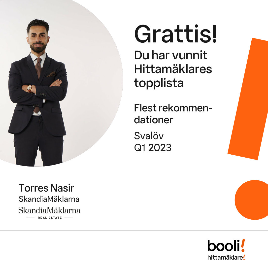 Statistik för publicerade bostäder, försäljningar och omdömen baseras på data från Booli och Hittamäklare. Statistiken för försäljningar avser inrapporterade och verifierade slutpriser från mäklare eller av Booli inhämtade och verifierade slutpriser. Statistiken för publicerade bostäder baseras på information som publicerats på Booli.se. Statistik för omdömen och rekommendationer baseras på omdömen från säljare som lämnats via Booli och Hittamäklare.