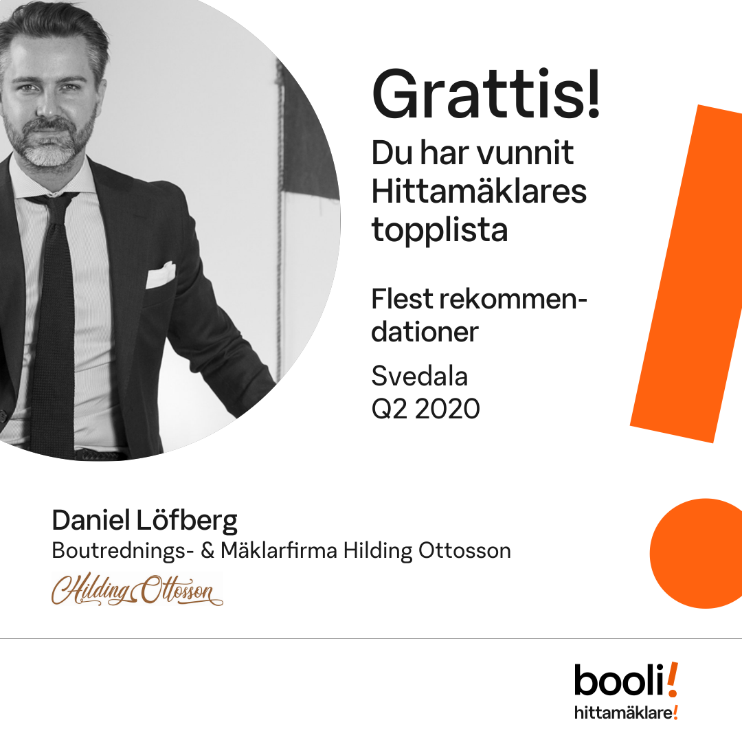 Statistik för publicerade bostäder, försäljningar och omdömen baseras på data från Booli. Statistiken för försäljningar avser inrapporterade och verifierade slutpriser från mäklare eller av Booli inhämtade och verifierade slutpriser. Statistiken för publicerade bostäder baseras på information som publicerats på Booli.se. Statistik för omdömen och rekommendationer baseras på omdömen från säljare som lämnats via Booli.