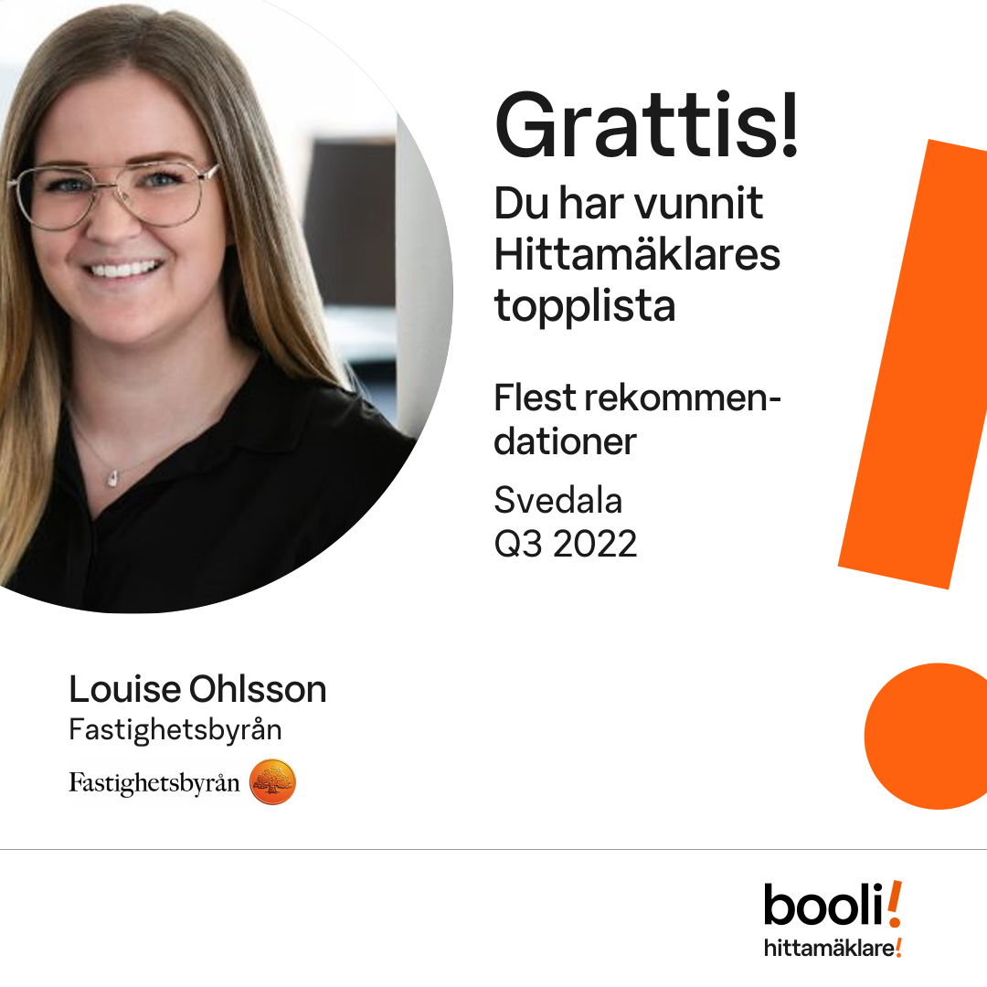 Statistik för publicerade bostäder, försäljningar och omdömen baseras på data från Booli och Hittamäklare. Statistiken för försäljningar avser inrapporterade och verifierade slutpriser från mäklare eller av Booli inhämtade och verifierade slutpriser. Statistiken för publicerade bostäder baseras på information som publicerats på Booli.se. Statistik för omdömen och rekommendationer baseras på omdömen från säljare som lämnats via Booli och Hittamäklare.