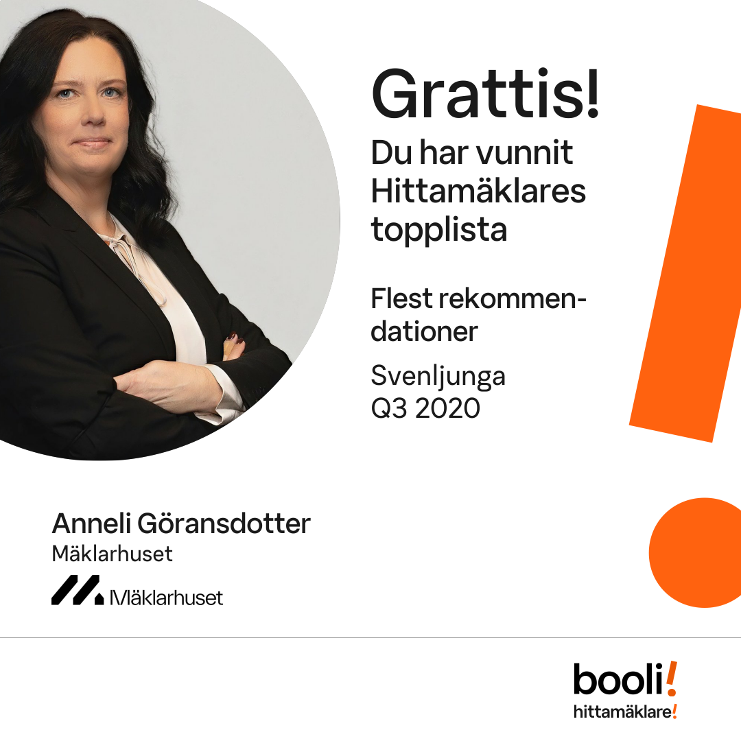Statistik för publicerade bostäder, försäljningar och omdömen baseras på data från Booli och Hittamäklare. Statistiken för försäljningar avser inrapporterade och verifierade slutpriser från mäklare eller av Booli inhämtade och verifierade slutpriser. Statistiken för publicerade bostäder baseras på information som publicerats på Booli.se. Statistik för omdömen och rekommendationer baseras på omdömen från säljare som lämnats via Booli och Hittamäklare.