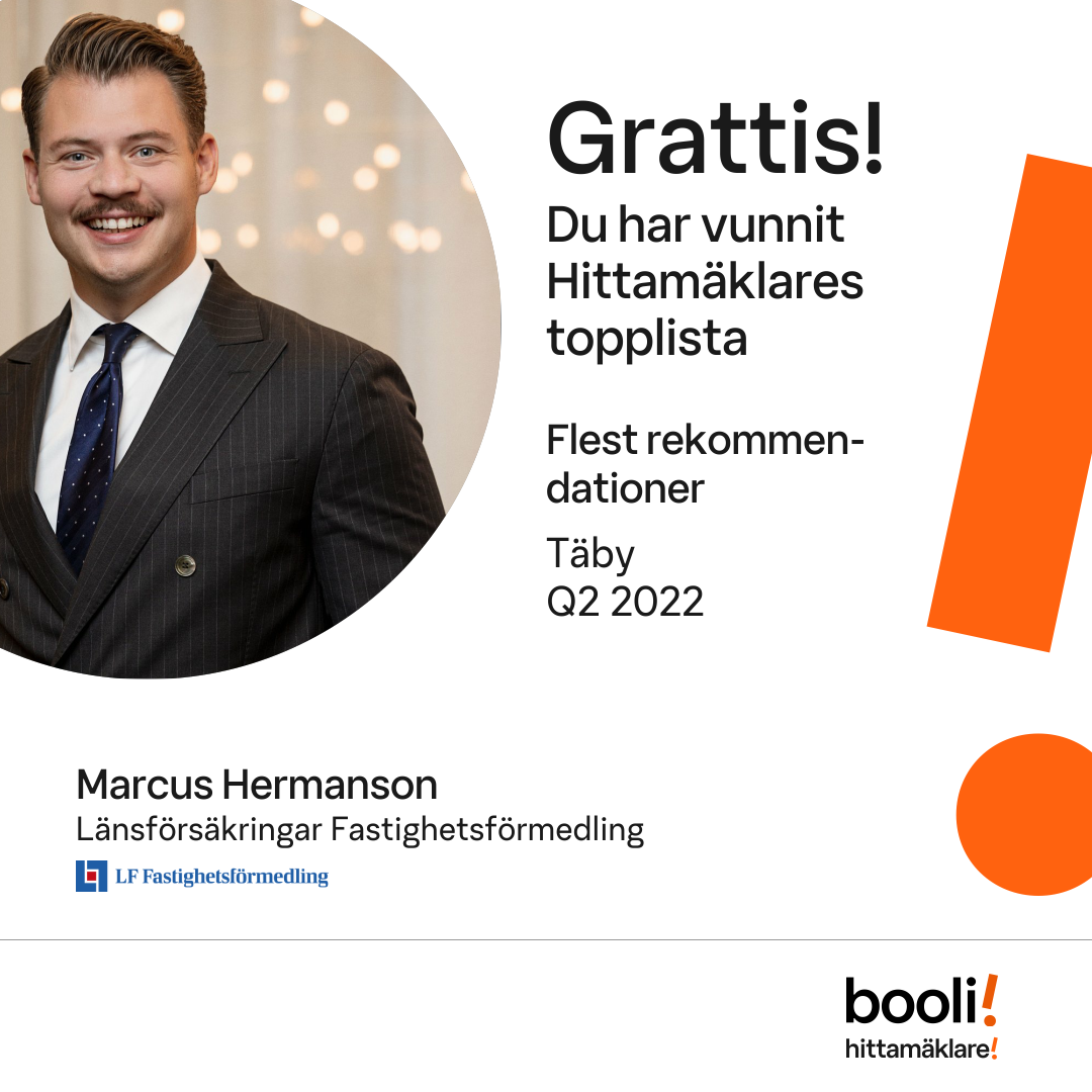 Statistik för publicerade bostäder, försäljningar och omdömen baseras på data från Booli och Hittamäklare. Statistiken för försäljningar avser inrapporterade och verifierade slutpriser från mäklare eller av Booli inhämtade och verifierade slutpriser. Statistiken för publicerade bostäder baseras på information som publicerats på Booli.se. Statistik för omdömen och rekommendationer baseras på omdömen från säljare som lämnats via Booli och Hittamäklare.