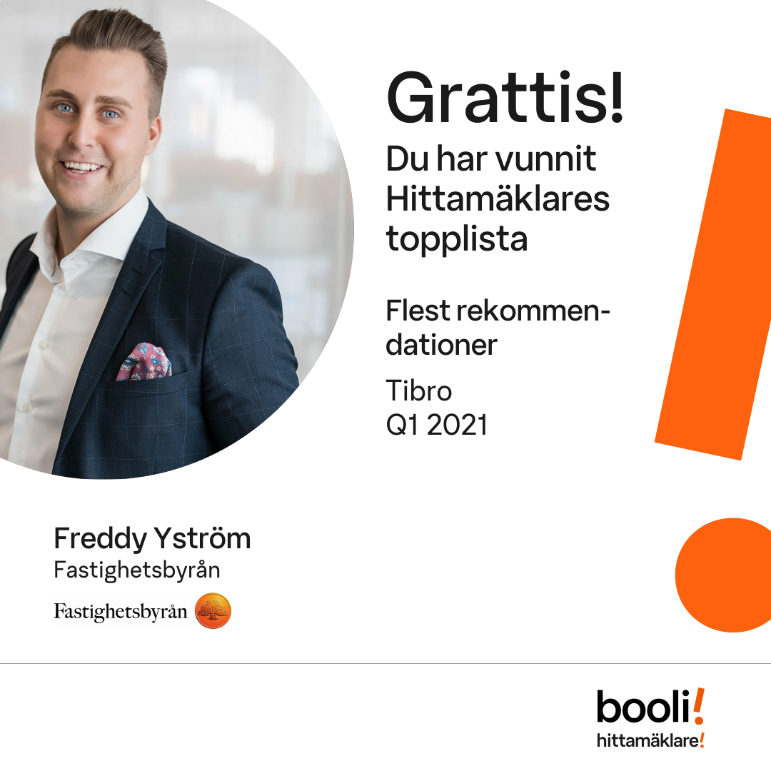 Statistik för publicerade bostäder, försäljningar och omdömen baseras på data från Booli och Hittamäklare. Statistiken för försäljningar avser inrapporterade och verifierade slutpriser från mäklare eller av Booli inhämtade och verifierade slutpriser. Statistiken för publicerade bostäder baseras på information som publicerats på Booli.se. Statistik för omdömen och rekommendationer baseras på omdömen från säljare som lämnats via Booli och Hittamäklare.