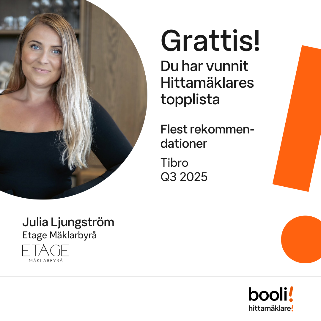 Statistik för publicerade bostäder, försäljningar och omdömen baseras på data från Booli och Hittamäklare. Statistiken för försäljningar avser inrapporterade och verifierade slutpriser från mäklare eller av Booli inhämtade och verifierade slutpriser. Statistiken för publicerade bostäder baseras på information som publicerats på Booli.se. Statistik för omdömen och rekommendationer baseras på omdömen från säljare som lämnats via Booli och Hittamäklare.