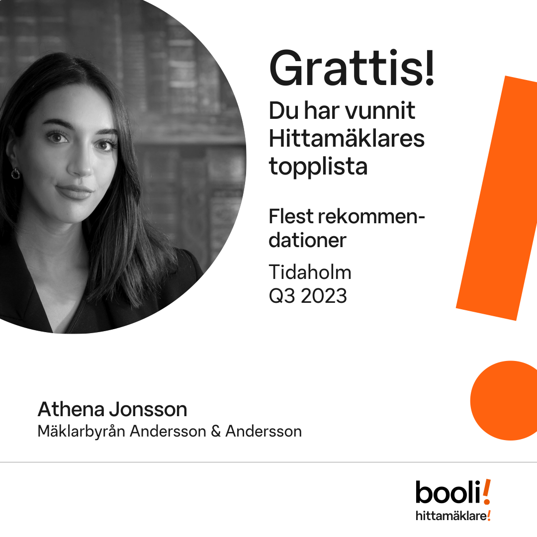 Statistik för publicerade bostäder, försäljningar och omdömen baseras på data från Booli och Hittamäklare. Statistiken för försäljningar avser inrapporterade och verifierade slutpriser från mäklare eller av Booli inhämtade och verifierade slutpriser. Statistiken för publicerade bostäder baseras på information som publicerats på Booli.se. Statistik för omdömen och rekommendationer baseras på omdömen från säljare som lämnats via Booli och Hittamäklare.