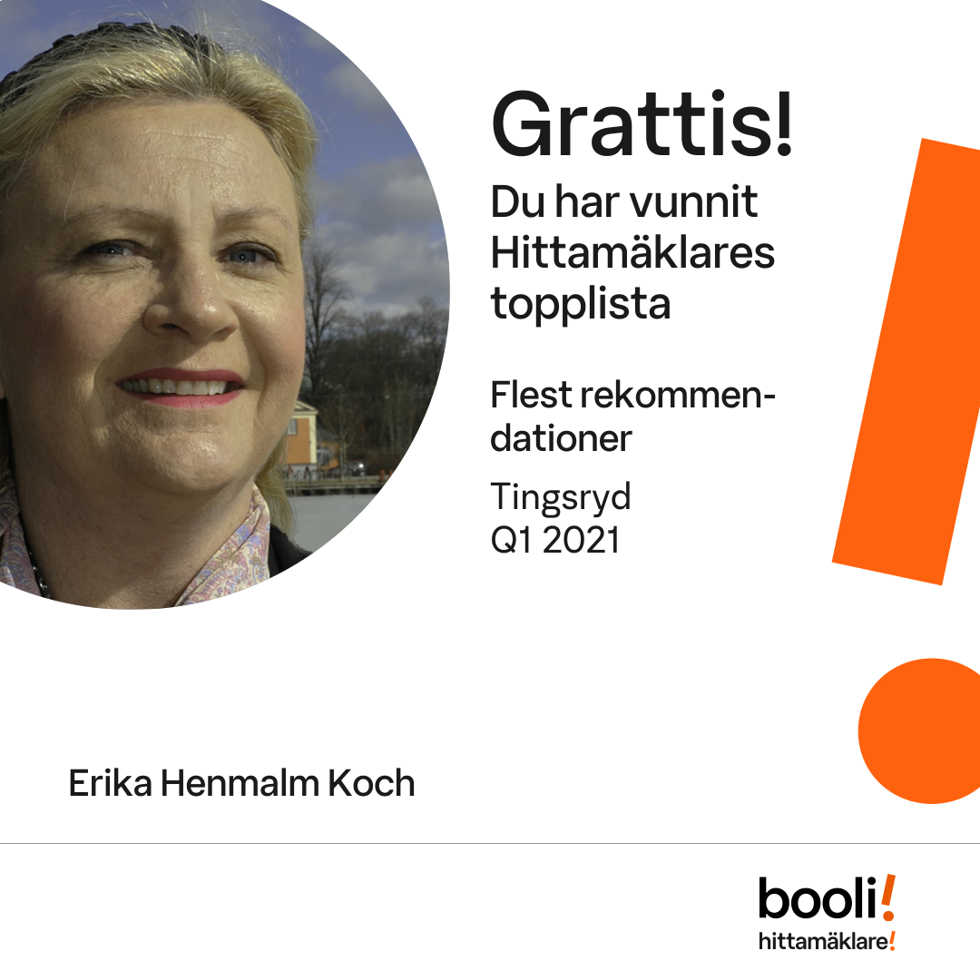 Statistik för publicerade bostäder, försäljningar och omdömen baseras på data från Booli och Hittamäklare. Statistiken för försäljningar avser inrapporterade och verifierade slutpriser från mäklare eller av Booli inhämtade och verifierade slutpriser. Statistiken för publicerade bostäder baseras på information som publicerats på Booli.se. Statistik för omdömen och rekommendationer baseras på omdömen från säljare som lämnats via Booli och Hittamäklare.