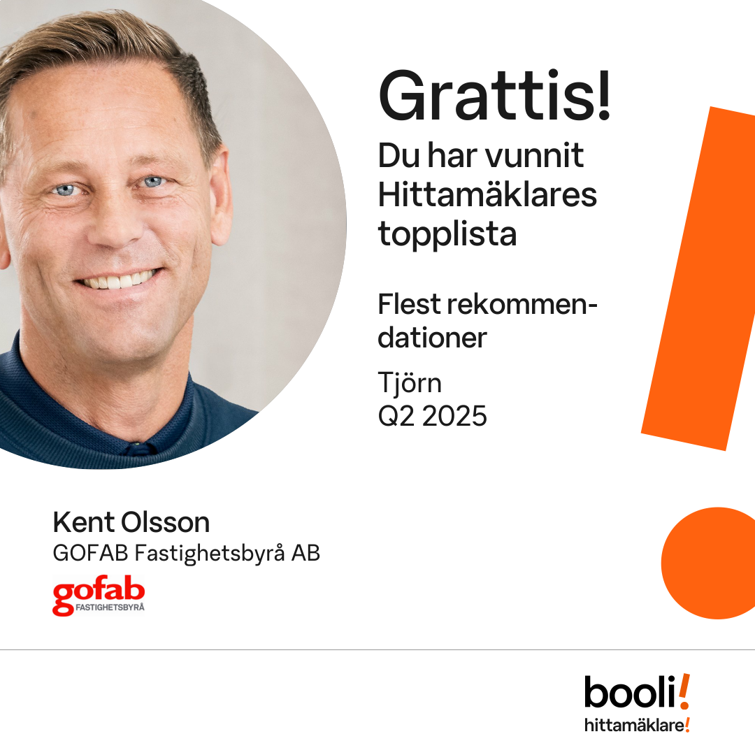 Statistik för publicerade bostäder, försäljningar och omdömen baseras på data från Booli och Hittamäklare. Statistiken för försäljningar avser inrapporterade och verifierade slutpriser från mäklare eller av Booli inhämtade och verifierade slutpriser. Statistiken för publicerade bostäder baseras på information som publicerats på Booli.se. Statistik för omdömen och rekommendationer baseras på omdömen från säljare som lämnats via Booli och Hittamäklare.
