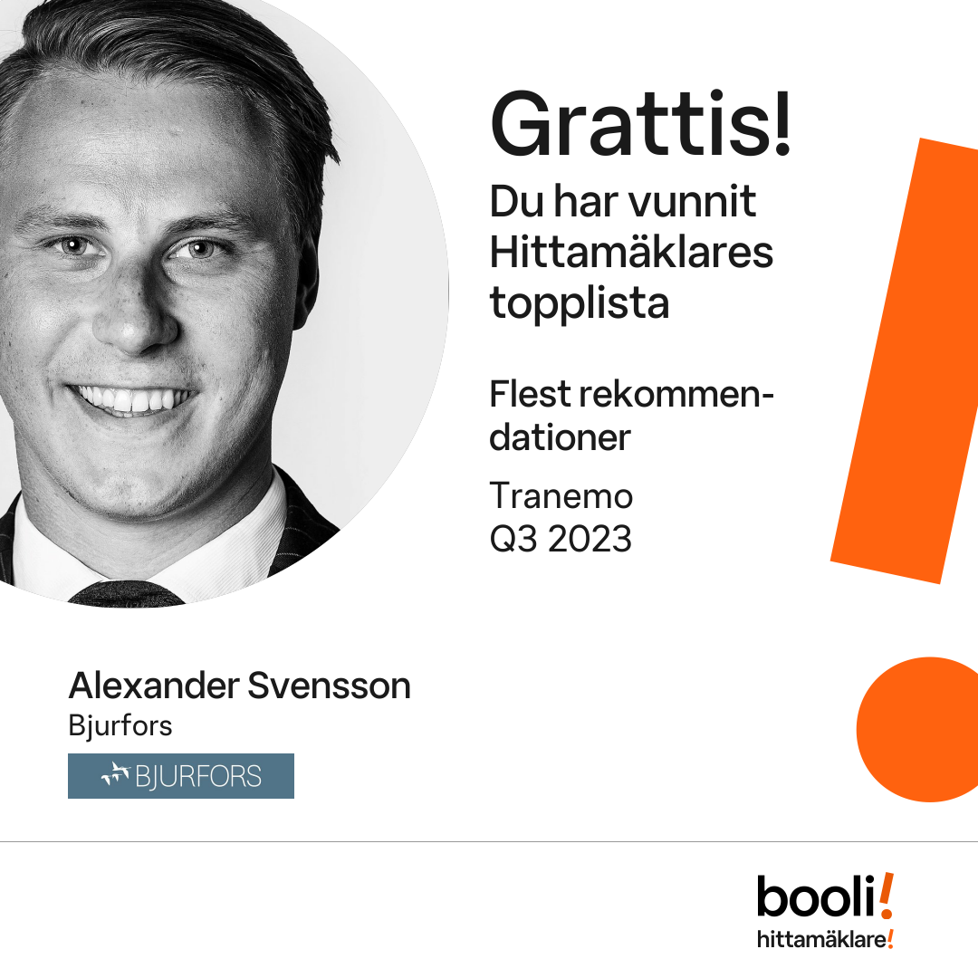 Statistik för publicerade bostäder, försäljningar och omdömen baseras på data från Booli och Hittamäklare. Statistiken för försäljningar avser inrapporterade och verifierade slutpriser från mäklare eller av Booli inhämtade och verifierade slutpriser. Statistiken för publicerade bostäder baseras på information som publicerats på Booli.se. Statistik för omdömen och rekommendationer baseras på omdömen från säljare som lämnats via Booli och Hittamäklare.