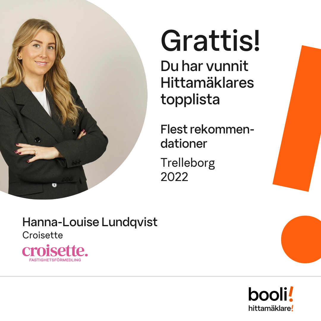 Statistik för publicerade bostäder, försäljningar och omdömen baseras på data från Booli. Statistiken för försäljningar avser inrapporterade och verifierade slutpriser från mäklare eller av Booli inhämtade och verifierade slutpriser. Statistiken för publicerade bostäder baseras på information som publicerats på Booli.se. Statistik för omdömen och rekommendationer baseras på omdömen från säljare som lämnats via Booli.