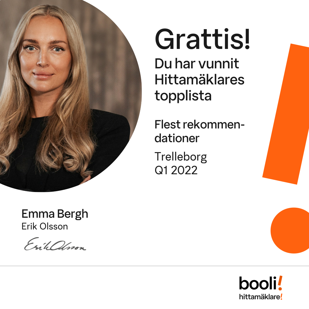 Statistik för publicerade bostäder, försäljningar och omdömen baseras på data från Booli och Hittamäklare. Statistiken för försäljningar avser inrapporterade och verifierade slutpriser från mäklare eller av Booli inhämtade och verifierade slutpriser. Statistiken för publicerade bostäder baseras på information som publicerats på Booli.se. Statistik för omdömen och rekommendationer baseras på omdömen från säljare som lämnats via Booli och Hittamäklare.