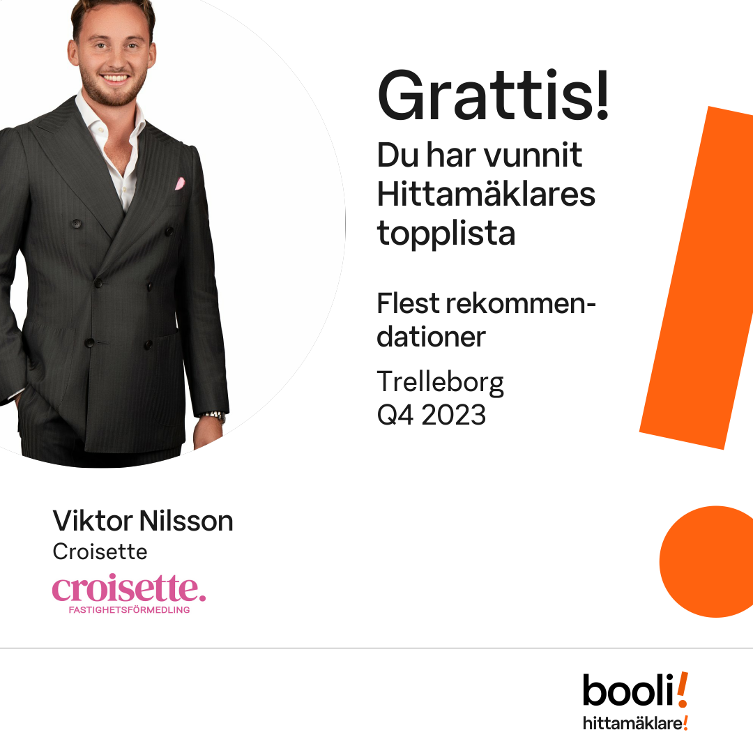 Statistik för publicerade bostäder, försäljningar och omdömen baseras på data från Booli. Statistiken för försäljningar avser inrapporterade och verifierade slutpriser från mäklare eller av Booli inhämtade och verifierade slutpriser. Statistiken för publicerade bostäder baseras på information som publicerats på Booli.se. Statistik för omdömen och rekommendationer baseras på omdömen från säljare som lämnats via Booli.