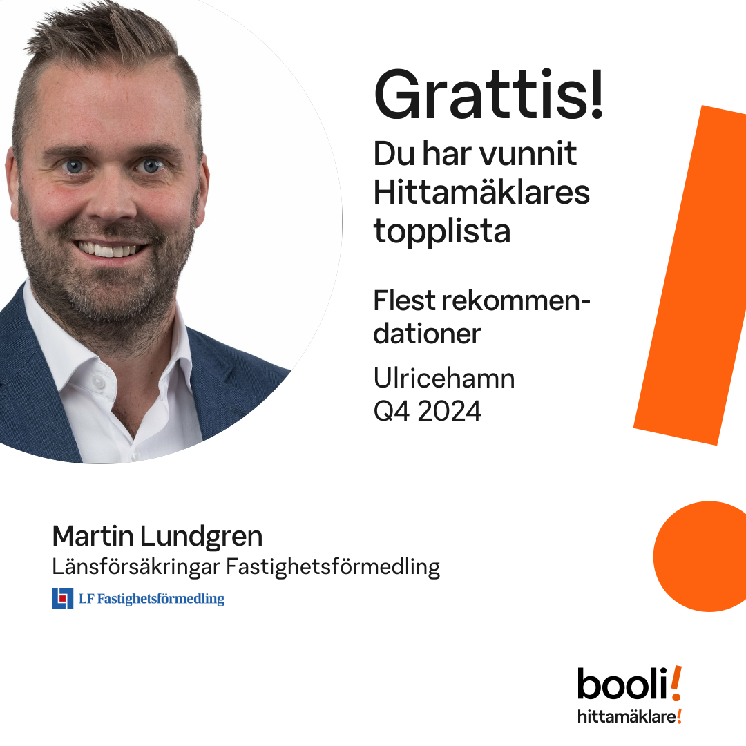 Statistik för publicerade bostäder, försäljningar och omdömen baseras på data från Booli och Hittamäklare. Statistiken för försäljningar avser inrapporterade och verifierade slutpriser från mäklare eller av Booli inhämtade och verifierade slutpriser. Statistiken för publicerade bostäder baseras på information som publicerats på Booli.se. Statistik för omdömen och rekommendationer baseras på omdömen från säljare som lämnats via Booli och Hittamäklare.